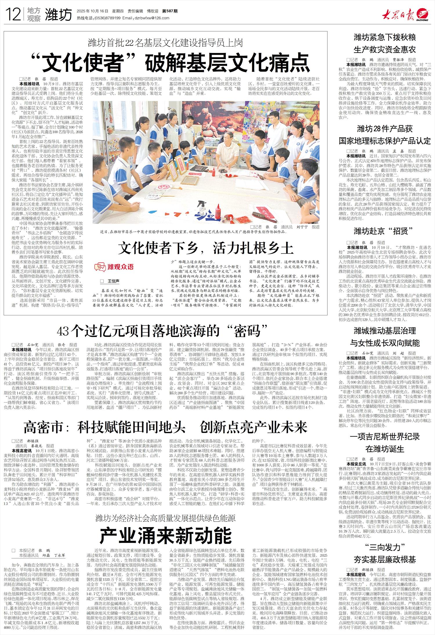 高密市积极搭建“政企研”对接平台,一年来,先后承办三次大型产业人才技术对接活动,为全市机械装备制造、化学化工、农业机械等重点领域对口引进专家32名,帮助26家企业破解48项技术难题。同时,组建25人的科技志愿服务博士团、40人的科技人才智库专家团及68人的科普志愿服务讲师团,为产业发展注入强劲科技动能。