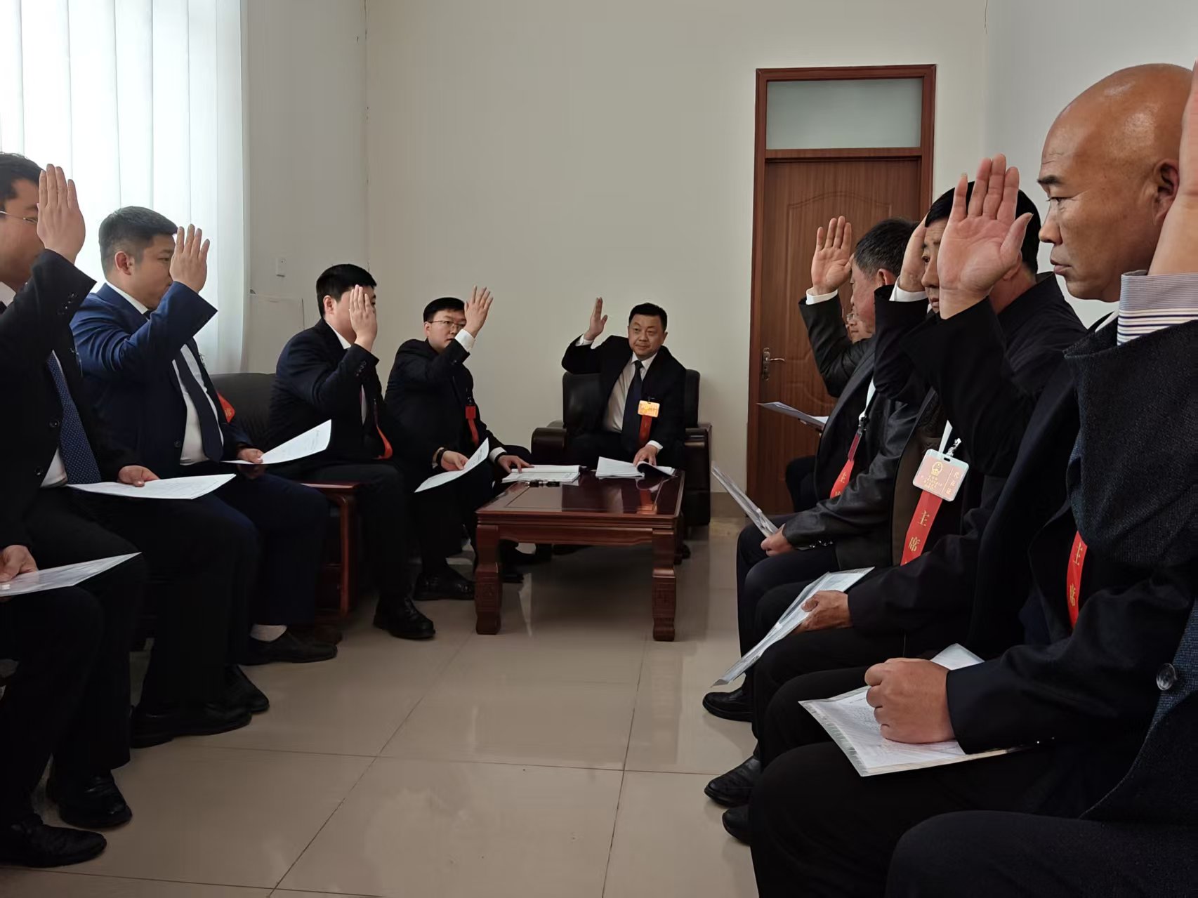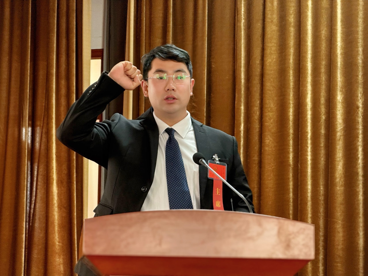 ▲新当选的镇人大副主席孙海洋进行宪法宣誓