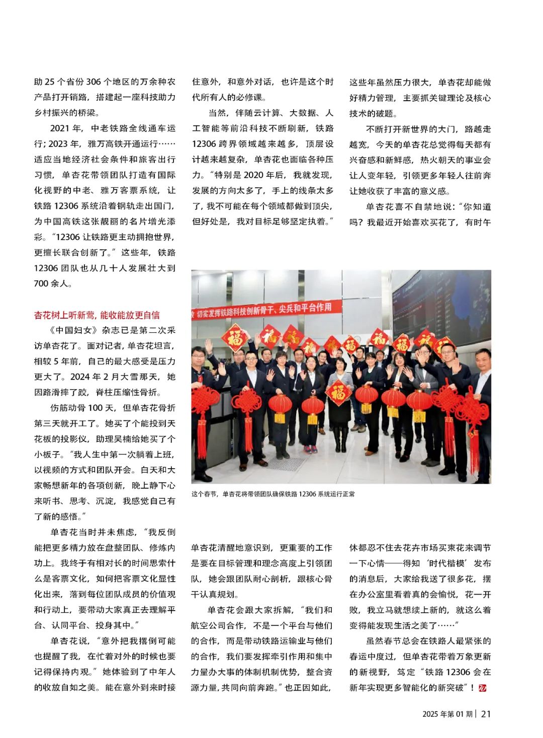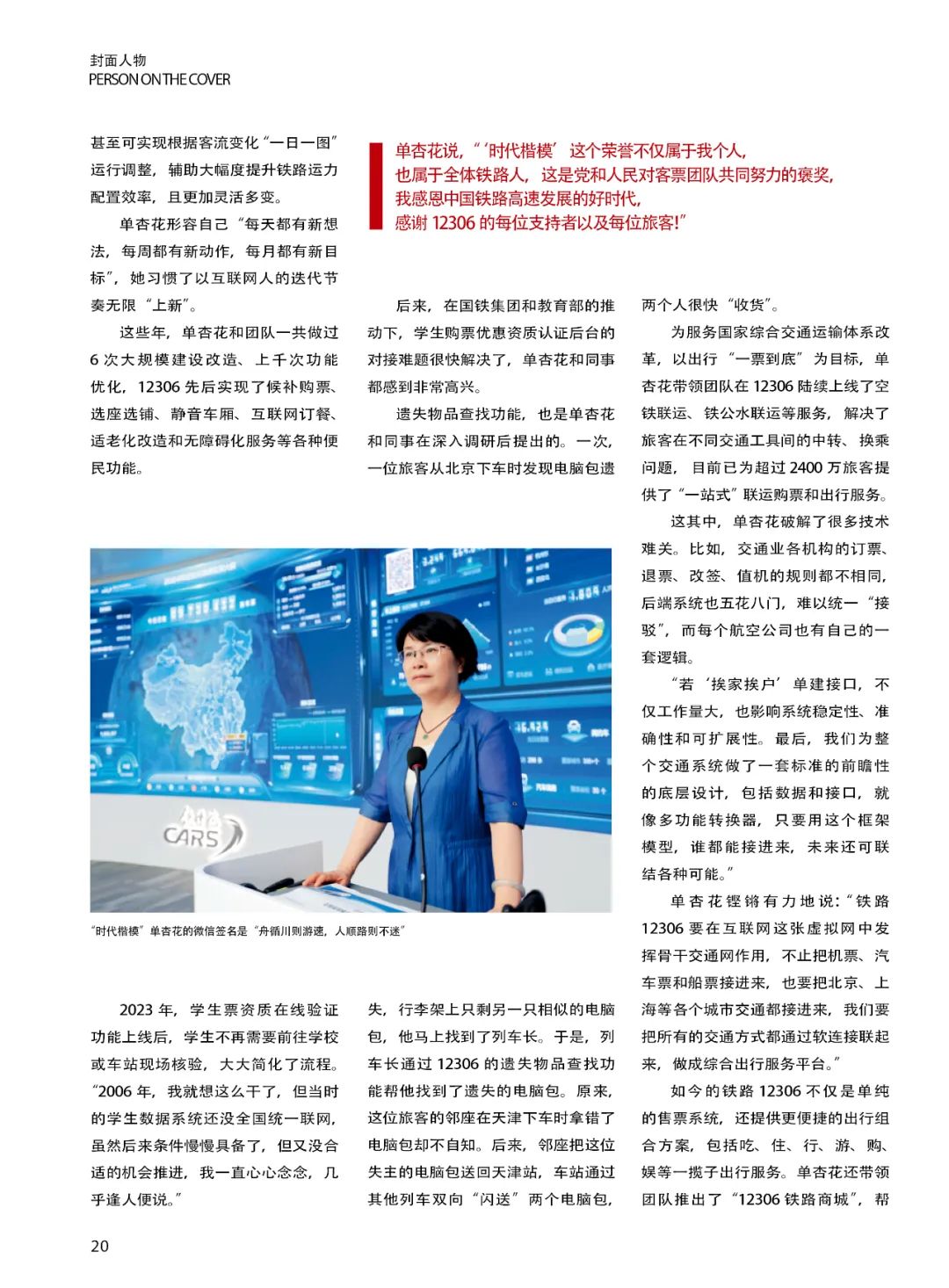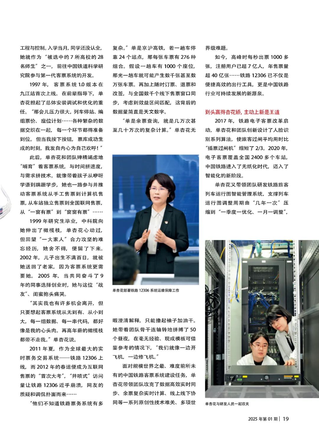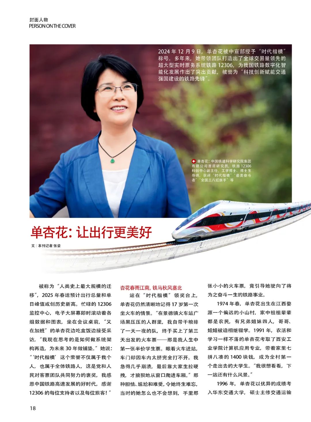 2024年12月9日,单杏花被中宣部授予“时代楷模”称号。多年来,她带领团队打造出了全球交易量领先的超大型实时票务系统铁路12306,为我国铁路数字化智能化发展作出了突出贡献,被誉为“科技创新赋能交通强国建设的铁路先锋”。左右滑动查看更多本文刊于《中国妇女》杂志这个春节,单杏花将带领团队确保铁路12306系统运行正常被称为“人类史上最大规模的迁移”,2025年春运预计出行总量和单日峰值或创历史新高。忙碌的12306监控中心,电子大屏幕即时滚动着各组数据和图表,坐在会议桌前,“又在加班”的单杏花边吃盒饭边接受采访,“我现在思考的是如何做系统架构再造,为未来30年做铺垫。”她说:“‘时代楷模’这个荣誉不仅属于我个人,也属于全体铁路人,这是党和人民对客票团队共同努力的褒奖,我感恩中国铁路高速发展的好时代,感谢12306的每位支持者以及每位旅客!”杏花春雨江南铁马秋风塞北单杏花 中国铁道科学研究院集团有限公司首席研究员,铁路12306科创中心副主任,工学博士、博士生导师,获评“时代楷模”“最美奋斗者”“全国三八红旗手”等站在“时代楷模”领奖台上,单杏花仍然清晰地记得17岁第一次坐火车的情景。“在景德镇火车站广场黑压压的人群里,我自带干粮排了一天一夜的队,终于买上了第三天出发的火车票——那是我人生中第一张半价学生票。眼看火车进站,车门却因车内太挤完全打不开。我急得几乎崩溃,最后靠大家生拉硬拽,才狼狈地从窗口爬进车厢。”那种胆怯、尴尬和难受,令她终生难忘,当时的她怎么也不会想到,手里那张小小的火车票,竟引导她驶向了将为之奋斗一生的铁路事业。1974年春,单杏花出生在江西婺源一个偏远的小山村,家中祖祖辈辈都是农民,有兄弟姐妹四人,哥哥、姐姐被迫相继辍学。1991年,农活和学习一样不落的单杏花考取了西安工业学院计算机应用专业,带着家里七拼八凑的1400块钱,成为全村第一个走出去的大学生。“我很想看看,下一站还有什么风景。”1996 年,单杏花以优异的成绩考入华东交通大学,硕士主修交通运输工程与控制。入学当月,同学还没认全,她就作为“被选中的7所高校的28 名师生”之一,前往中国铁道科学研究院参与第一代客票系统的开发。1997年,客票系统1.0版本在九江站首次上线。在前辈指导下,单杏花担起了总体安装调试和优化的重任。“那会儿压力很大,列车停站、编组票价、座位计划……各种繁杂的数据交织在一起,每一个环节都得准备到位。但当我按下按钮,票库成功生成的时刻,我发自内心为自己欢呼!”此后,单杏花和团队殚精竭虑地“哺育”着客票系统,与时间拼速度,与需求拼技术。就像带着孩子从咿呀学语到蹒跚学步,她也一路参与并推动客票系统从手工售票到计算机售票,从车站独立售票到全国联网售票,从“一窗有票”到“窗窗有票”……1999年研究生毕业,中科院向她伸出了橄榄枝,单杏花心动过,但回望“一大家人”合力攻坚的难忘经历,她舍不得,便留了下来。2002年,儿子出生不满百日,就被她送回了老家,因为客票系统更需要她。2005 年,当共同奋斗了9年的同事选择创业时,她与这位“战友”、闺蜜抱头痛哭。“其实我也有许多机会离开,但只要想起客票系统从无到有、从小到大,每一组数据、每一串代码,都好像是我的心头肉。再高年薪的橄榄枝都带不走我。”单杏花说。单杏花与研发人员一起攻关2011年夏,作为全球最大的实时票务交易系统——铁路12306上线,而2012年的春运便成为互联网售票的“首次大考”,“井喷式”访问量让铁路12306近乎崩溃,网友的质疑和调侃扑面而来……“他们不知道铁路票务系统有多复杂。”单是京沪高铁,若一趟车停靠24个站点,那每张车票有276种组合。假设一趟车有1000个座位,那光一趟车就可能产生数千张甚至数万张车票。再加上随时订票、退票和改签,与全国数千个线下售票窗口同步,考虑到效益区间匹配,这背后的数据量简直是天文数字。“单是余票查询,就是几万次甚至几十万次的复杂计算。”单杏花无暇澄清解释,只能撸起袖子加油干。她带着团队骨干连轴转地拼搏了50个昼夜,在毫无经验、现成模板可借鉴参考的情况下,“我们就像一边开飞机,一边修飞机。”面对规模世界之最、难度前所未有的中国铁路客票系统建设任务,单杏花带领团队攻克了数据高效实时同步、余票复杂实时计算、线上线下协同等一系列原创性技术难关、多项世界级难题。如今,高峰时每秒出票1000多张,注册用户已超7亿人,年售票量超40亿张……铁路12306已不仅是便捷高效的出行工具,更是中国铁路行业可持续发展的新源泉。到头赢得杏花娇主动上新是王道2017年,铁路电子客票改革启动,单杏花和团队创新设计了人脸识别系列算法,使旅客过闸平均用时比“插票过闸机”缩短了2/3。2020年,电子客票覆盖全国2400多个车站,中国铁路进入了无纸化时代,迈入了智能化的新阶段。单杏花又带领团队研发铁路旅客列车运行图智能管理系统,支撑列车运行图调整周期由“几年一次”压缩到“一季度一优化、一月一调整”,甚至可实现根据客流变化“一日一图”运行调整,辅助大幅度提升铁路运力配置效率,且更加灵活多变。单杏花形容自己“每天都有新想法,每周都有新动作,每月都有新目标”,她习惯了以互联网人的迭代节奏无限“上新”。单