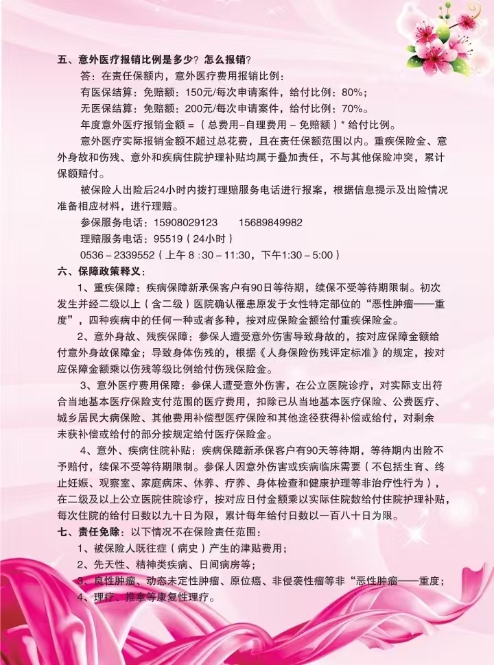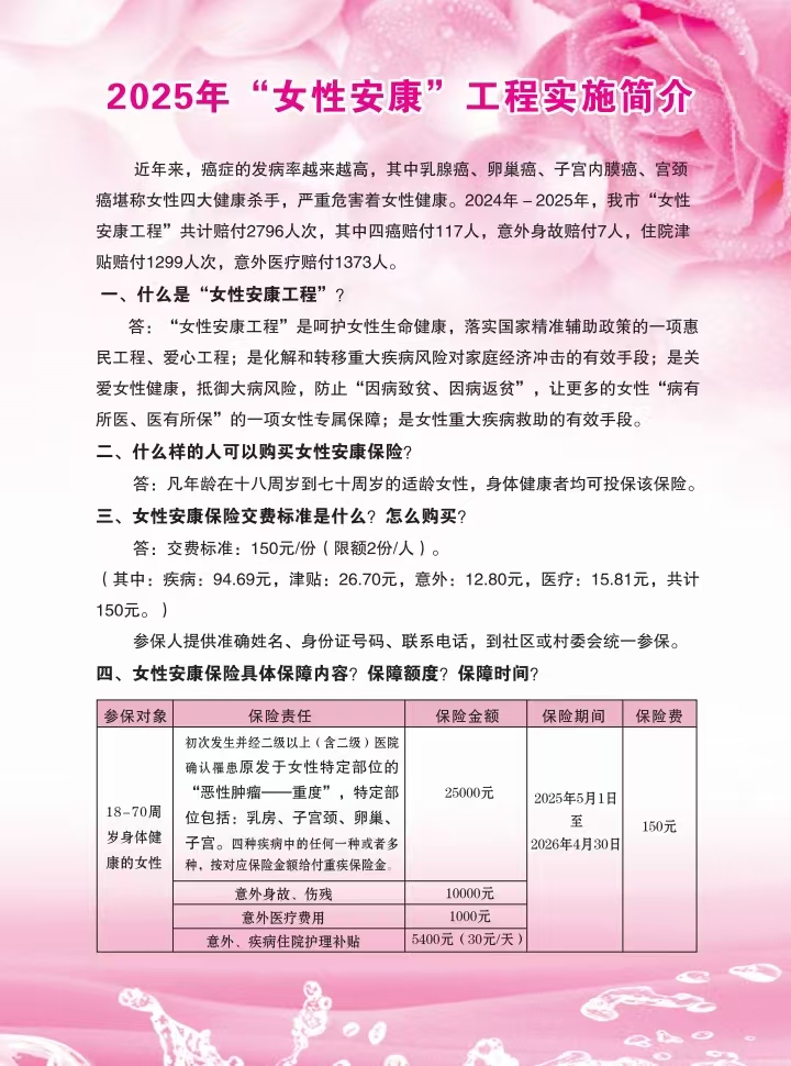 2025.032025年度“女性安康”保险投保工作开始啦!“女性安康工程”是在“两癌”免费检查基础上,由全国妇联与中国人寿联合推出的让更多女性“病有所医、医有所保”的一项民生工程,为多发且发病率上升的特定疾病提供高额保障以及人身意外伤害保障,具有保费低、保障高、保障范围广等特点,对于缓解患者及家庭经济压力具有十分重要的意义。2025年度“女性安康”保险投保工作正全面展开,现将有关事项通知如下。2025年“女性安康”工程实施简介来源:中国人寿保险公司高密分公司编辑:单馨语、付伟君 审核:王翔、王越声明:转载请注明来源