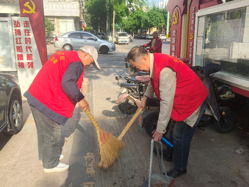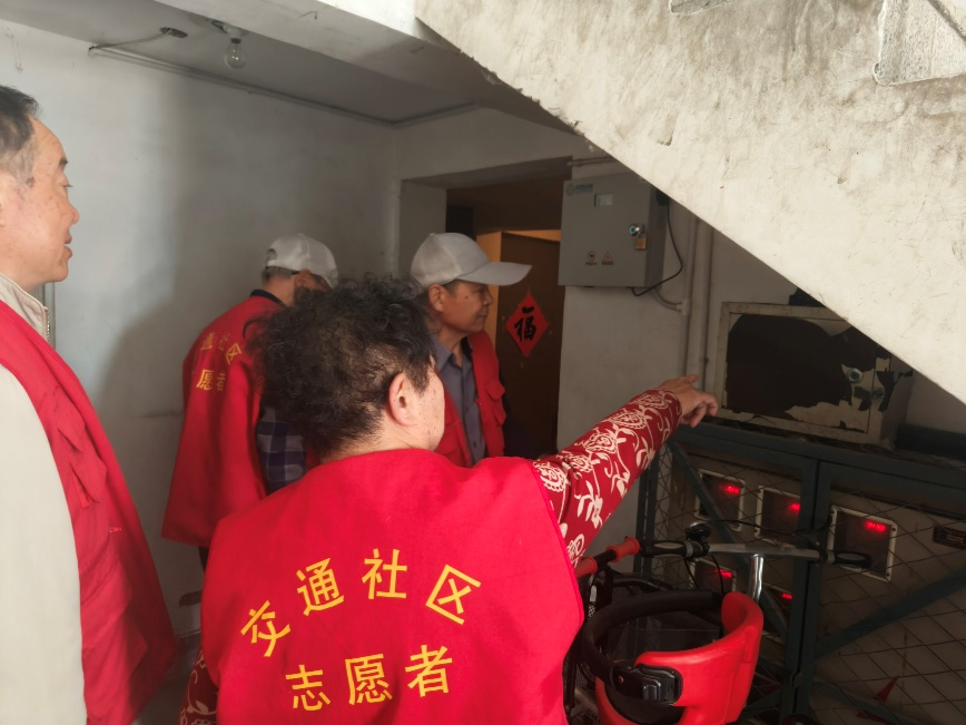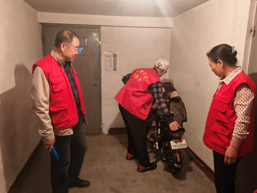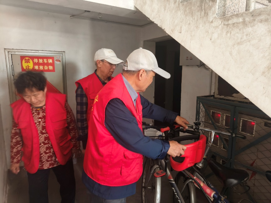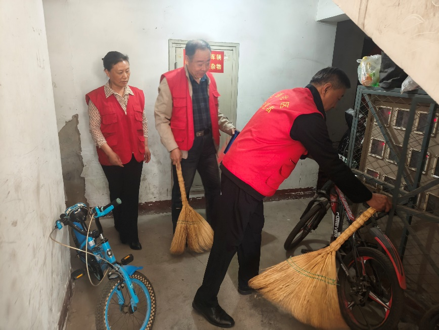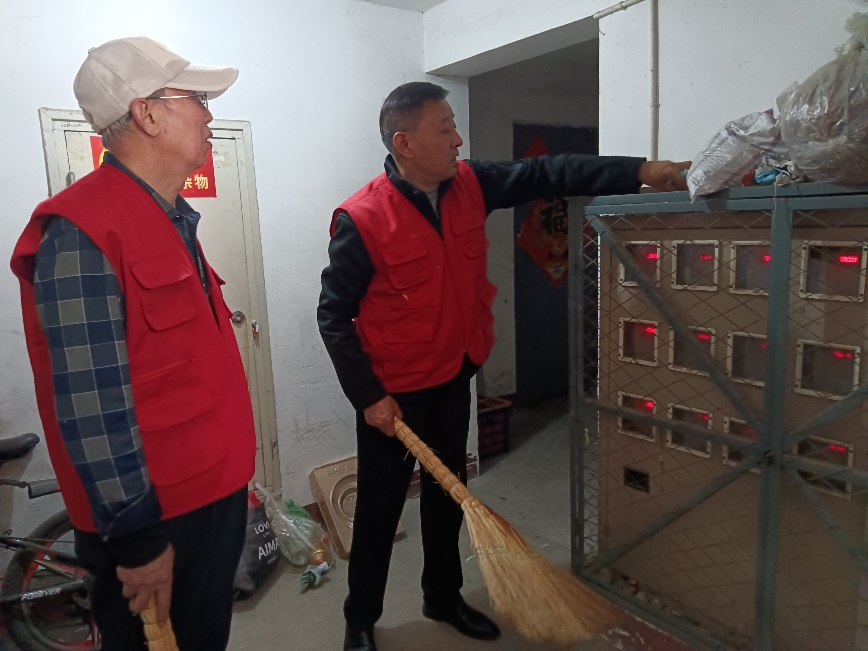 单秀芬同志带领支部内的老同志们化身社区“安全环保卫士”,深入小区内开展安全隐患排查治理行动,仔细清理配电盘上堆放的纸箱、垃圾等易燃杂物,并将楼栋内堆积已久的卫生死角彻底整治,有效消除电气火灾隐患。同时,逐户排查电动车违规停放、私拉电线充电等问题,耐心向居民讲解消防安全知识,提醒大家重视用电安全。