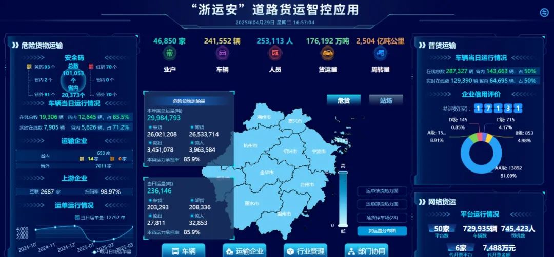 浙江各级交通运输部门不仅通过数字化手段筑牢汛期“安全堤”,还推动“两客一危”、农村客运企业建立健全与气象等部门的联勤联动机制,多渠道向运输企业推送气象预报预警信息,建立健全恶劣天气和突发地质灾害下的停运机制。“我们还陆续开展‘两客一危’车辆动态监控预警预防能力提升专项治理行动,重点排查治理运输企业安全主体责任落实情况,以及属地管理部门安全监管责任落实情况。”浙江省交通运输厅相关负责人表示。
