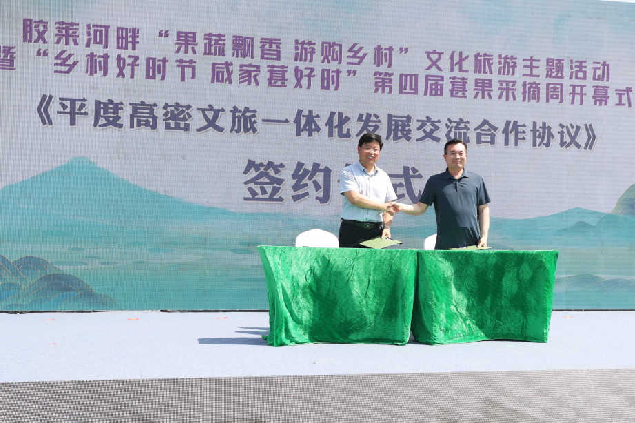 ▲平度市文旅局党组书记、局长李培强与高密市文旅局党委书记、局长,市文化和旅游产业发展中心党支部书记、主任于义签订《平度高密文旅一体化发展交流合作协议》