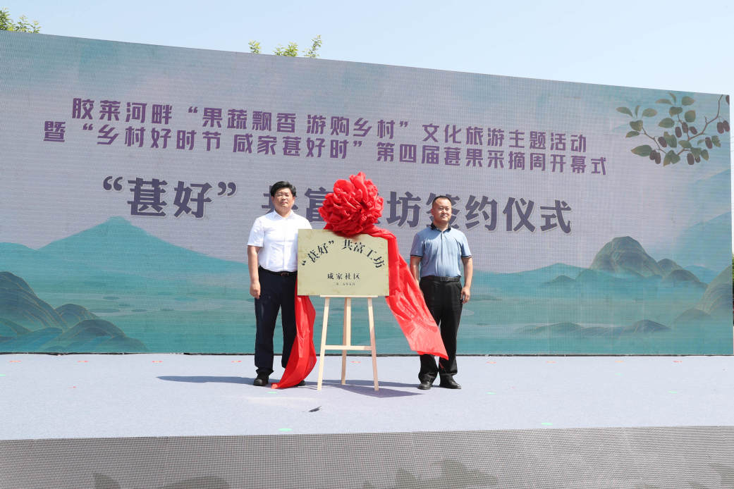 ▲市委组织部副部长唐召康与咸家社区党委书记沙涛为“葚好”共富工坊揭牌