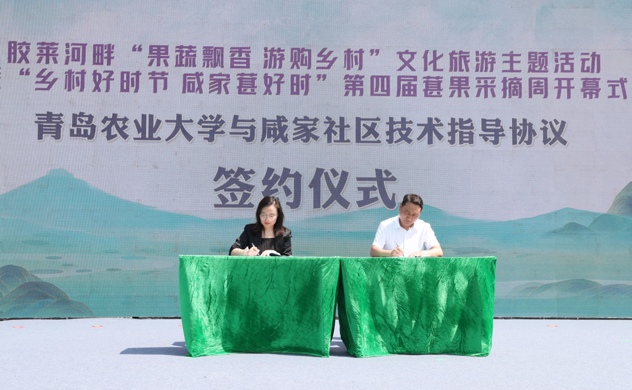 ▲青岛农业大学郭丽萍教授与咸家社区党委副书记、管委会主任尚成龙签订技术指导协议