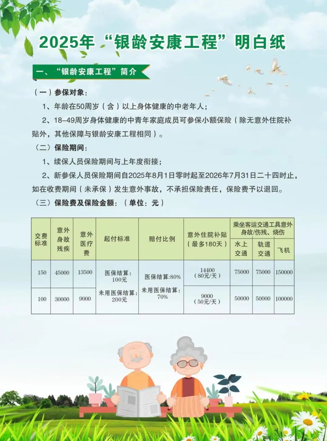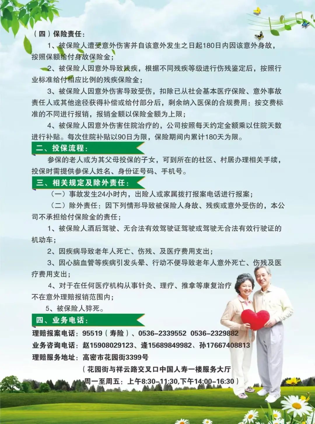 各位村民: 2025年高密市“银龄安康工程”已开始收缴,凡年龄在50周岁(含)以上身体健康的中老年人均可参保,18-49周岁身体健康的中青年家庭成员可参保小额保险。 今年我市“银龄安康工程”参保缴费标准分为100元、150元两个档次,参保缴费时间为2025年7月18日至8月15日。具体参保交费事宜可直接联系各村(社区)干部。 业务电话: 理赔报案电话: 95519(寿险) 0536-2339552 0536-2329882 业务咨询电话: 赵15908029123 逢15689849982 孙17667408813 理赔服务地址:高密市花园街3399号 (花园街与祥云路交叉口中国人寿一楼服务大厅周一至周五:上午8:30-11:30,下午14:00-16:30)